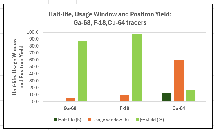 Figure 1: Half-life, Usage Window and Positron Yield of Ga-68, F-18, and Cu-64 tracers
