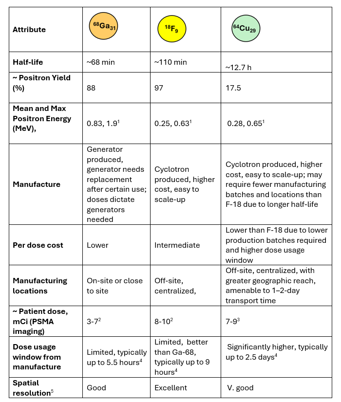 Table 1: Comparison of Ga-68, F-18 and Cu-64 PET Tracers